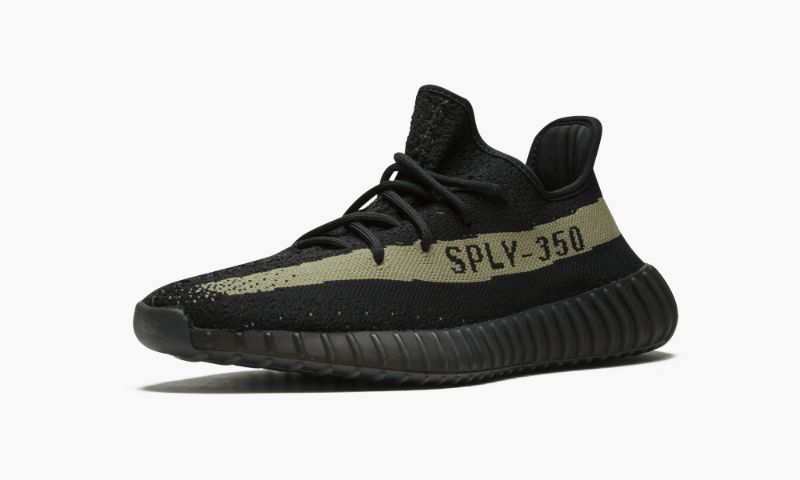 matching black rubber midsole that covers the full-length Boost foam cushioning. Its discerning feature is the olive green stripe that runs from heel to toe. The signature “SPLY-350” message appears throughout the stripe in black script, while
